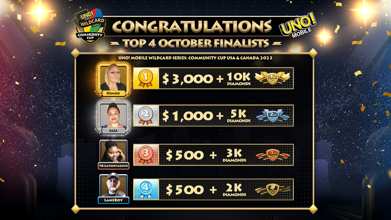 After a year of wildly unpredictable monthly matches, UNO!™ Mobile Wildcard Series: Community Cup USA & Canada 2023 has announced the final monthly winner! Romeo from New York, USA is the October monthly champion and the last monthly winner of the year!