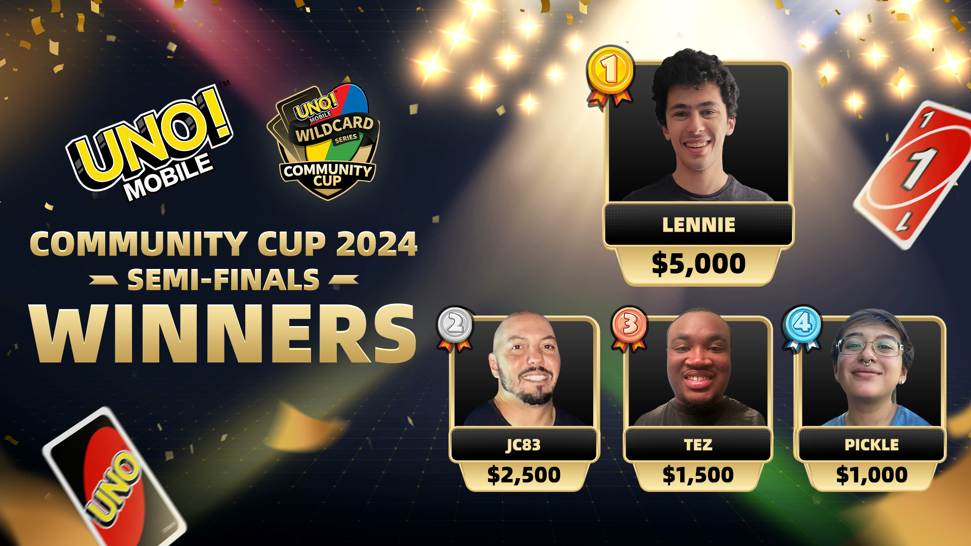 From UNO! Mobile and Mattel163, we would also like to say congratulations to our runner-up JC83 from Florida, and 3rd and 4th place players Tez from Georgia and Pickle from Michigan. A special thanks to the rest of the top 8 players for securing the remaining spots in the Annual Grand Finals in January 2025!